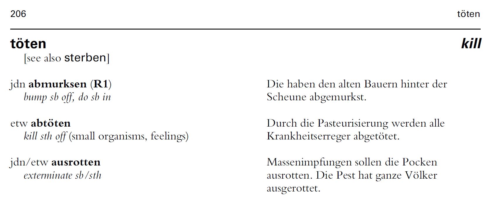 Martin Durrell a été titulaire de la Chaire d’Allemand de l’Université de Manchester. Il a publié en 2010, aux très perstigieuses Cambridge University Press, un ouvrage intitulé Using German Synonyms (ISBN 0-521-46552-4). La page consacrée aux synonymes de töten (tuer) commence ainsi: