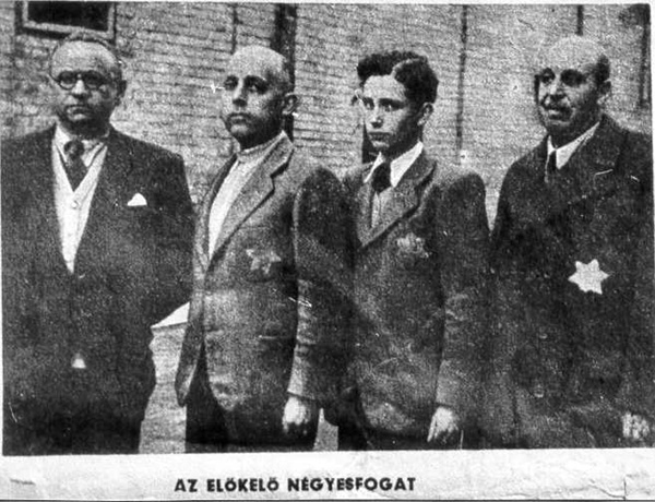 | 01-0424 | Internment camp. "The illustrious quartet (four-in-hand)." [written on the picture] the first man from the left is Mr. Rozsnyai the composer. He does not wear the yellow star because his wife is Christian. It did not help, however: he and his wife were murdered. |