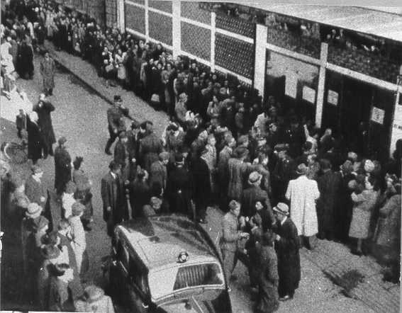 are queuing in front of the so called "Glass House" (Budapest, Vadász street no. 29.) which was protected by the Swiss embassy.