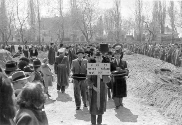 Funeral procession held for exhumed bodies of Jewish forced laborers (Budapest).