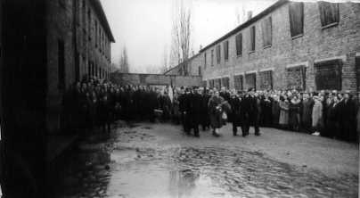 People lined up to celebrate in the Auschwitz camp after the Second World War.