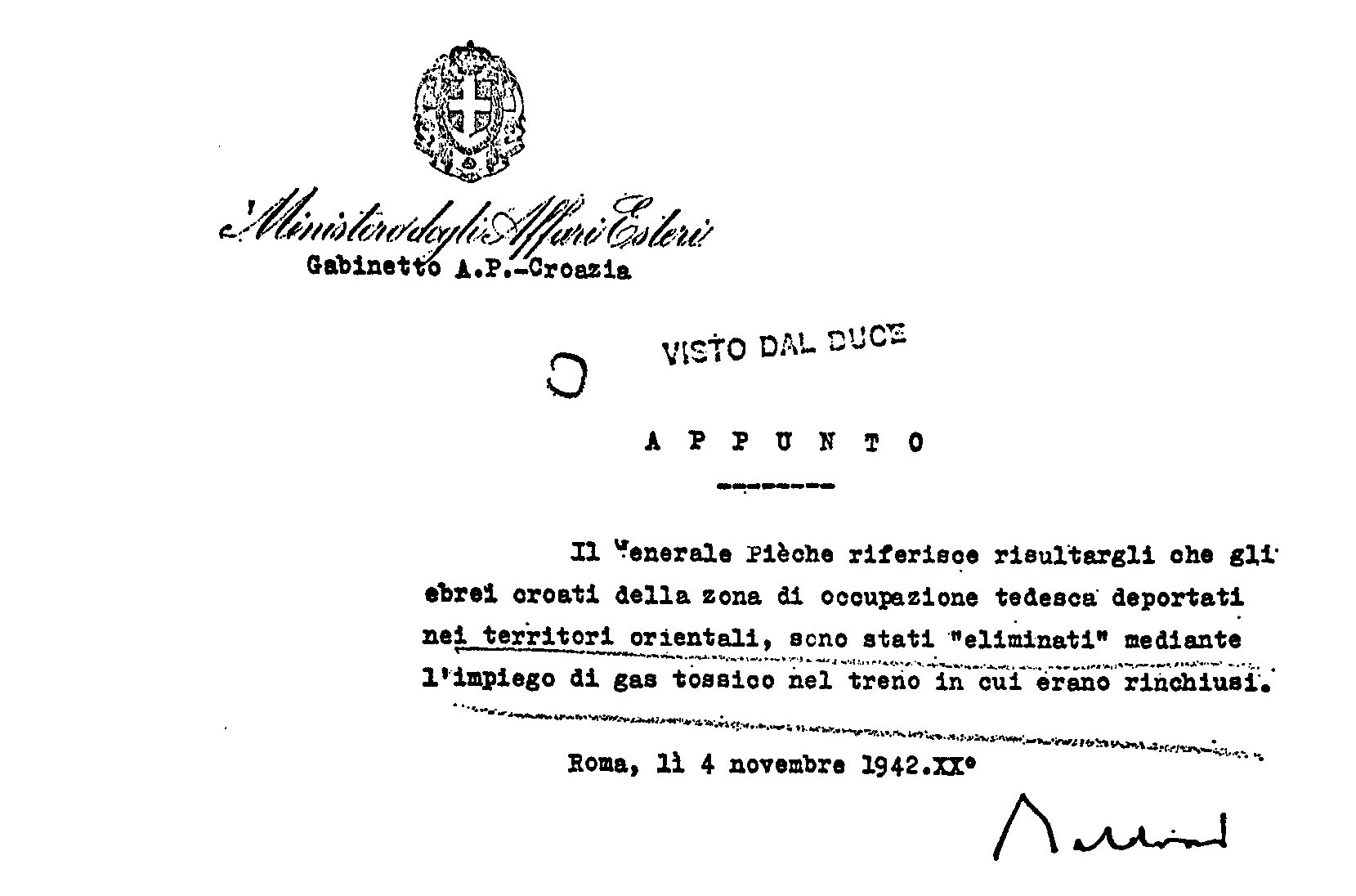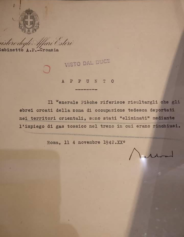244. Luca Pietromarchi, «Estratti del diario private» in Joseph Rochlitz, The Righteous Enemy. The Italians and Jews in Occupied Europe 1941–43. A collection of notes and research materials for the documentary film, Rome, 1988, p. 10, cité par Jonathan Steinberg, All or Nothing: The Axis and the Holocaust, 1941-1943, Routledge, 1990, p. 126. La source, non publiée, de Jonathan Steinberg est constituée par les notes préparatoires du documentariste Joseph Rochlitz pour son film de 1987 sur les tentatives de sauvetages de certains Juifs par des fascistes italiens (dont une version française, plus courte, existe). Jonathan Steinberg ne produit pas la version originale en italien et sa traduction en anglais comporte une erreur que nous corrigeons à partir de cette version originale italienne (publiée en fait en 1987, voir ci-après). Il traduit «Essi vengono tutti gassati, senza distinzione, di vecchi, donne e bambini» par «They will all be gassed without distinction, the old women, babies» alors que cela signifie «Ils sont tous gazés sans distinction, des vieux jusqu’aux femmes et aux bébés». Voici la version originale italienne (passage complet): «Bastianini si e riservato di parlare di nuovo al Duce della cosa con elementi piu precisi. Ed infatti ha avuto da Vidau le ultime notizie ricevute da Berlino degli orrendi massacri perpetrati contro gli ebrei e le ha portate al Duce. “La vera ragione dell’atteggiamento dei nostri ufficiali, non vi è stata detta da Ambrosio ma ve la dirò io Duce, i nostri sanno quale la sorte che attende gli ebrei che verranno consegnati ai tedeschi. Essi vengono tutti gassati, senza distinzione, di vecchi, donne e bambini. è perciò che i nostri non permetteranno mai che con la loro connivenza si compiano simili atrocità. E Voi, Duce, non dovete acconsentirvi. Perché volete assumervi questa responsabilità che ricade interamente su di Voi?” Questo è stato il coraggioso di Bastianini» (Luca Pietromarchi, «Frammenti delle memorie dell’ambasciatore Luca Pietromarchi. La difesa degli ebrei nel ’43», Nuova Antologia, 2161, janvier-mars 1987, p. 245-246).