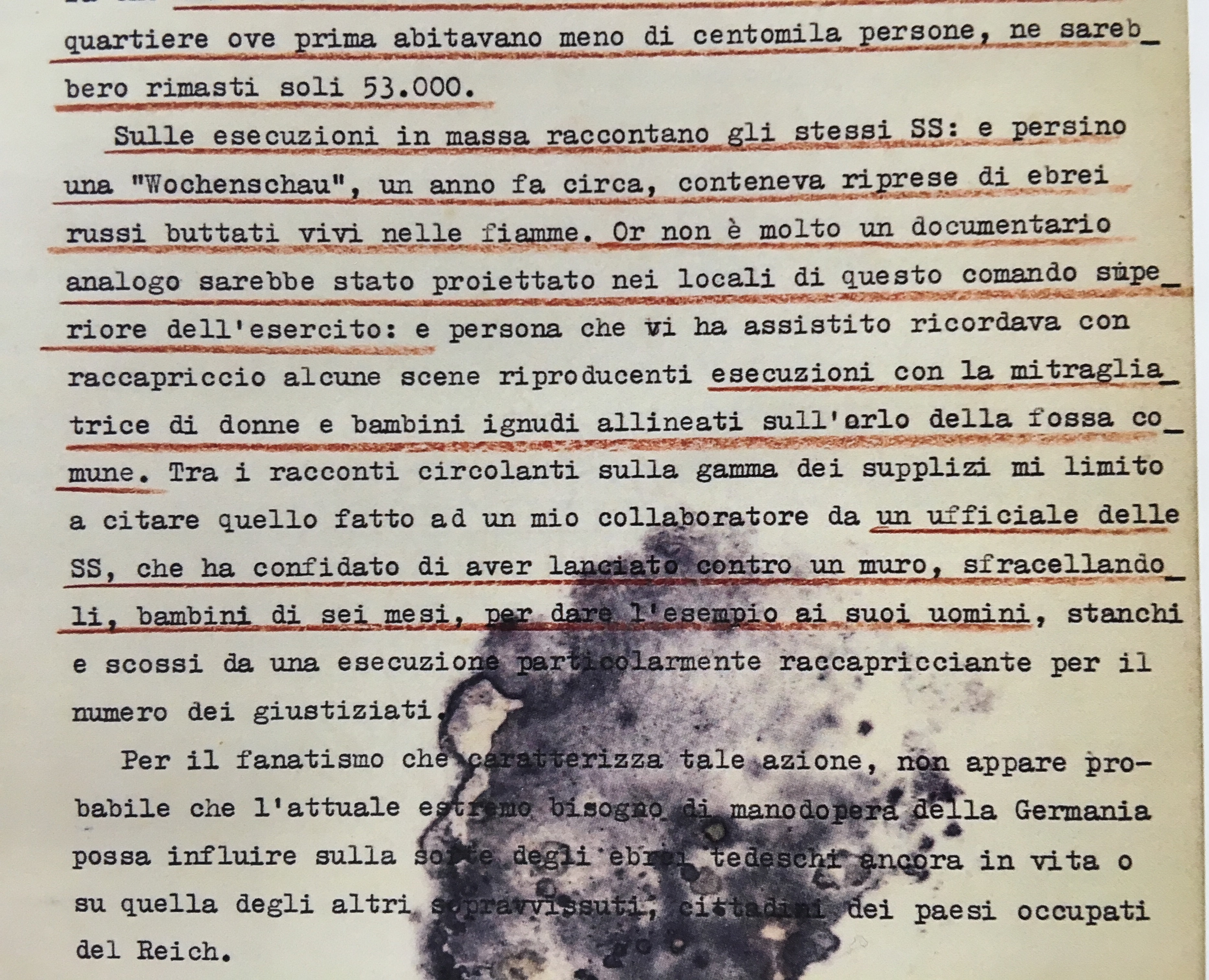 236. Notre traduction d’après l’original italien: «Sulla sorte ad essi riserbata, come su quella cui sono andati e vanno incontro gli ebrei polacchi, russi, olandesi ed anche francesi, non possono nutrirsi molti dubbi. Mentre queste autorità non hanno fatto e non fanno mistero degli scopi prefissi (e cosi Rosenberg, in un discorso tenuto alla fine dello scorso anno al congresso del fronte tedesco del lavoro, ha confermato la volontà di sterminare appieno la razza ebraica, qualificandone lo sterminio totale come azione umanitaria, perché tale da risanare i popoli europei) consta che i ghetti di Lublino e di Varsavia sarebbero andati rapidamente svuotandosi, sia per le epidemie e la fame, sia per le esecuzioni. La fonte cui già ho accennato riferiva giorni fa che dei 600 mila ebrei riuniti nel solo ghetto di Varsavia, in quartiere ove prima abitavano meno di centomila persone, ne sarebbero rimasti soli 53 mila. Sulle esecuzioni in massa raccontano gli stessi SS […] e persona che vi ha assistito ricordava con raccapriccio alcune scene riproducenti esecuzioni con la mitragliatrice di donne e bambini ignudi allineati sull’orlo della fossa comune. Tra i racconti circolanti sulla gamma dei supplizi mi limito a citare quello fatto ad un mio collaboratore da un ufficiale delle SS, che ha confidato di aver lanciato contro un muro, sfracellandoli, bambini di sei mesi, per dare l’esempio ai suoi uomini, stanchi e scossi da una esecuzione particolarmente raccapricciante per il numero dei giustiziati.» (Alfieri à Ciano, 3 février 1943, dans Ministero degli Affari Esteri, Commissione per la pubblicazione de i documenti diplomatici, I Documenti diplomatici italiani, Nona Serie: 1939-1943, vol. IX (21 luglio 1942 - 6 febbraio 1943), Rome: Istituto Poligrafico e Zecca dello Stato P.V., 1989, p. 582-583). Saul Friedländer cite partiellement ce passage dans la traduction suivante : «Concernant les sort [des Juifs allemands déportés], comme celui des Juifs polonais, russes, hollandais et même français, il n’y a guère de doute possible… Même les SS parlent d’exécutions en masse… Une personne qui se trouvait là-bas a raconté avec horreur certaines scènes d’exécutions à la mitrailleuse de femmes et d’enfants nus alignés au bord d’une fosse commune. Pour ce qui est des tortures en tout genre, je me contenterai de l’histoire rapportée à mon collègue par un SS qui confia avoir balancé des bébés de six mois contre un mur, les fracassant, histoire de donner un exemple à ses hommes, las et ébranlés après une éxécution particulièrement horrible à cause du nombre de victimes» (Saul Friedländer, Les Années d’Extermination…, op. cit., p. 564. L’auteur commet une erreur en datant ce courrier du 3 janvier 1943 et non du 3 février, erreur que ne commet pas la source secondaire dont il tire cet extrait, Susan Zuccotti, Under His Very Windows. The Vatican and the Holocaust in Italy, New Haven, 2000, p. 108-109). Nous tirons la reproduction partielle du document original que nous proposons d’un article en ligne sur l’exposition italienne «Solo il dovere, oltre il dovere. La diplomazia italiana di fronte alla persecuzione degli ebrei 1938–1943», en ligne…