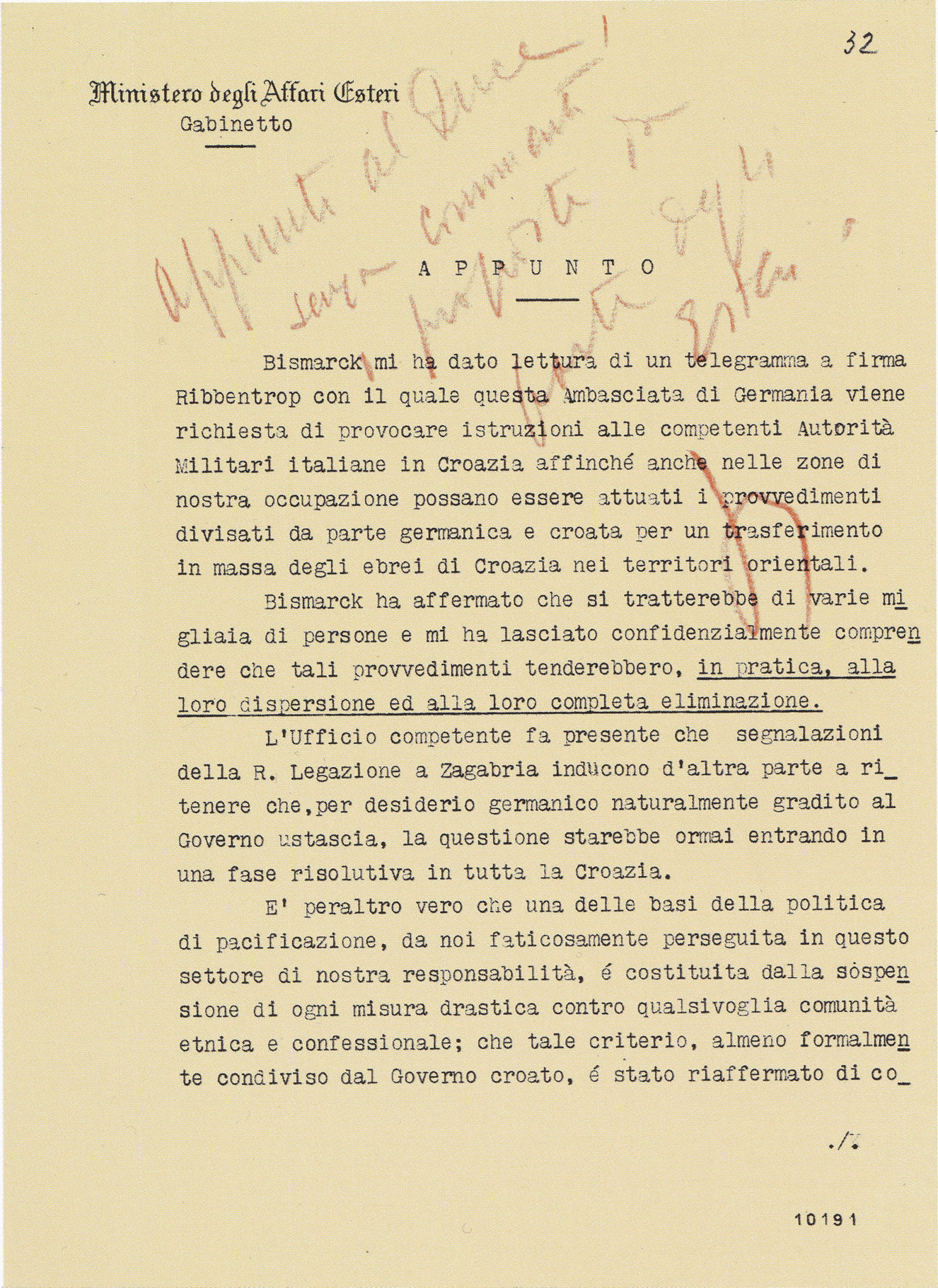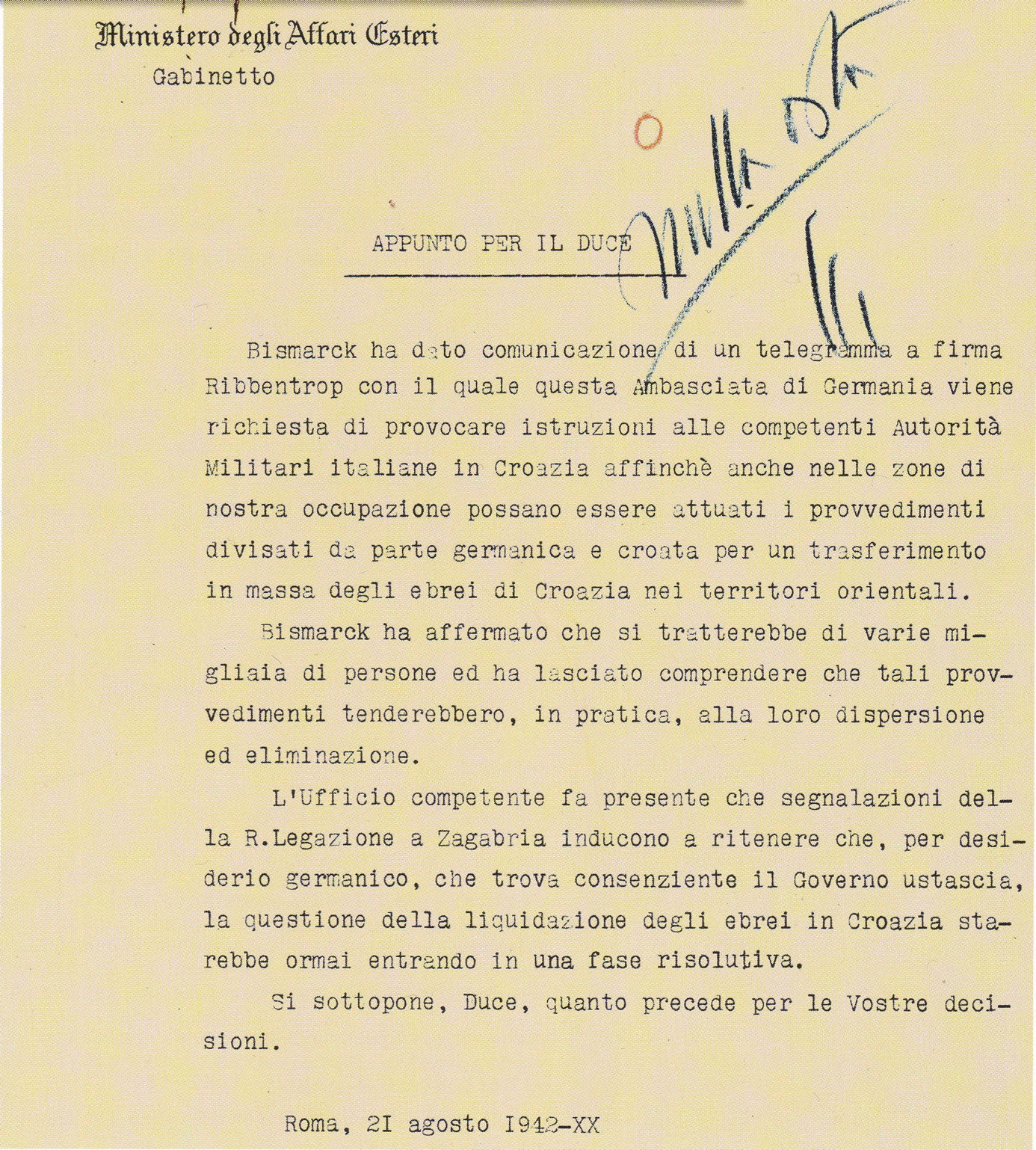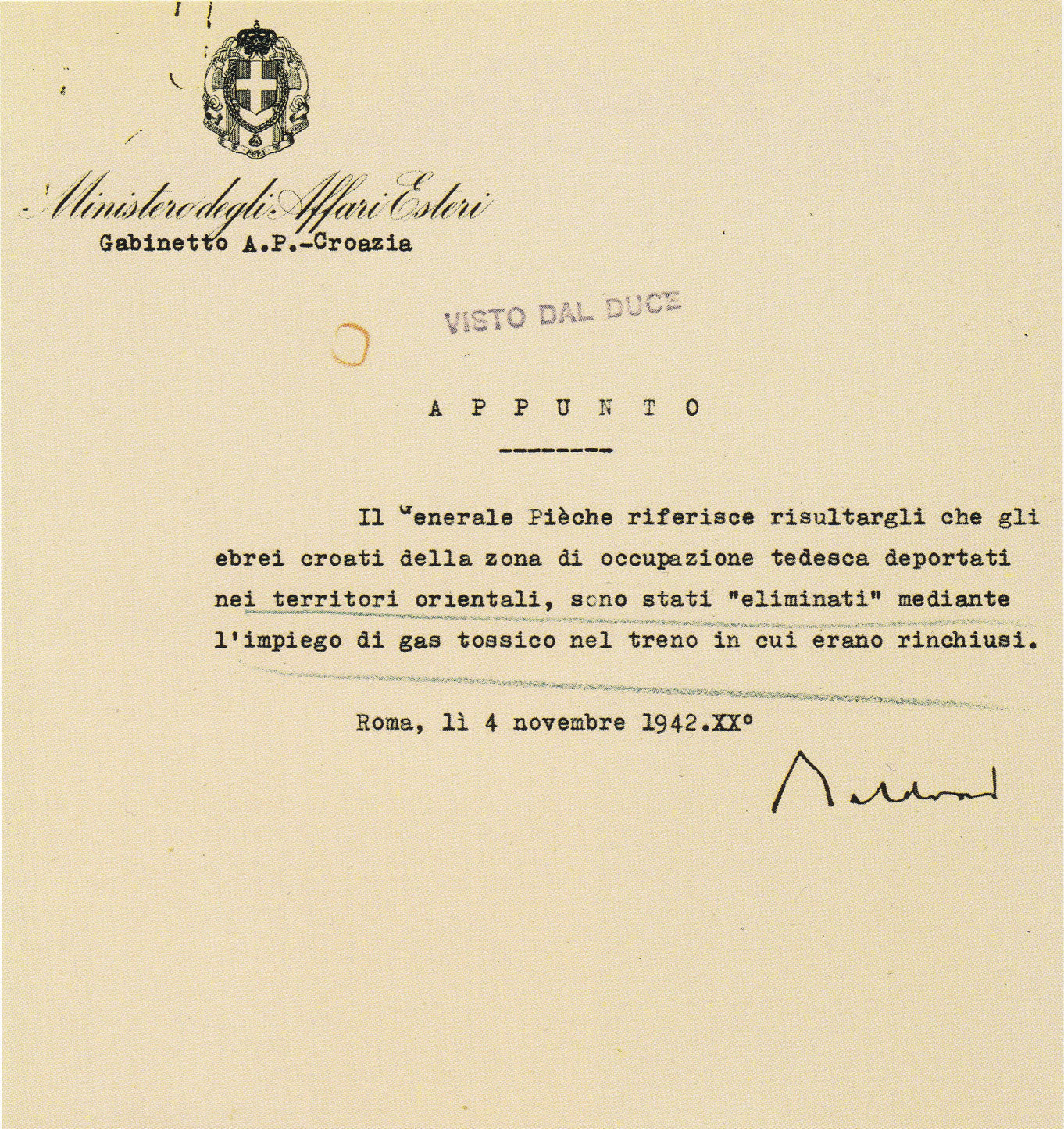 247. Luca Pietromarchi, «Estratti del diario private» in Joseph Rochlitz, The Righteous Enemy. The Italians and Jews in Occupied Europe 1941–43. A collection of notes and research materials for the documentary film, Rome, 1988, p. 10, cité par Jonathan Steinberg, All or Nothing: The Axis and the Holocaust, 1941-1943, Routledge, 1990, p. 126. La source, non publiée, de Jonathan Steinberg est constituée par les notes préparatoires du documentariste Joseph Rochlitz pour son film de 1987 sur les tentatives de sauvetages de certains Juifs par des fascistes italiens (dont une version française, plus courte, existe). Jonathan Steinberg ne produit pas la version originale en italien et sa traduction en anglais comporte une erreur que nous corrigeons à partir de cette version originale italienne (publiée en fait en 1987, voir ci-après). Il traduit «Essi vengono tutti gassati, senza distinzione, di vecchi, donne e bambini» par «They will all be gassed without distinction, the old women, babies» alors que cela signifie «Ils sont tous gazés sans distinction, des vieux jusqu’aux femmes et aux bébés». Voici la version originale italienne (passage complet): «Bastianini si e riservato di parlare di nuovo al Duce della cosa con elementi piu precisi. Ed infatti ha avuto da Vidau le ultime notizie ricevute da Berlino degli orrendi massacri perpetrati contro gli ebrei e le ha portate al Duce. “La vera ragione dell’atteggiamento dei nostri ufficiali, non vi è stata detta da Ambrosio ma ve la dirò io Duce, i nostri sanno quale la sorte che attende gli ebrei che verranno consegnati ai tedeschi. Essi vengono tutti gassati, senza distinzione, di vecchi, donne e bambini. è perciò che i nostri non permetteranno mai che con la loro connivenza si compiano simili atrocità. E Voi, Duce, non dovete acconsentirvi. Perché volete assumervi questa responsabilità che ricade interamente su di Voi?” Questo è stato il coraggioso di Bastianini» (Luca Pietromarchi, «Frammenti delle memorie dell’ambasciatore Luca Pietromarchi. La difesa degli ebrei nel ’43», Nuova Antologia, 2161, janvier-mars 1987, p. 245-246).